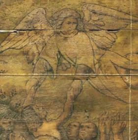 omhoog trekt. Lucht, landschap, kleding van de engel en de